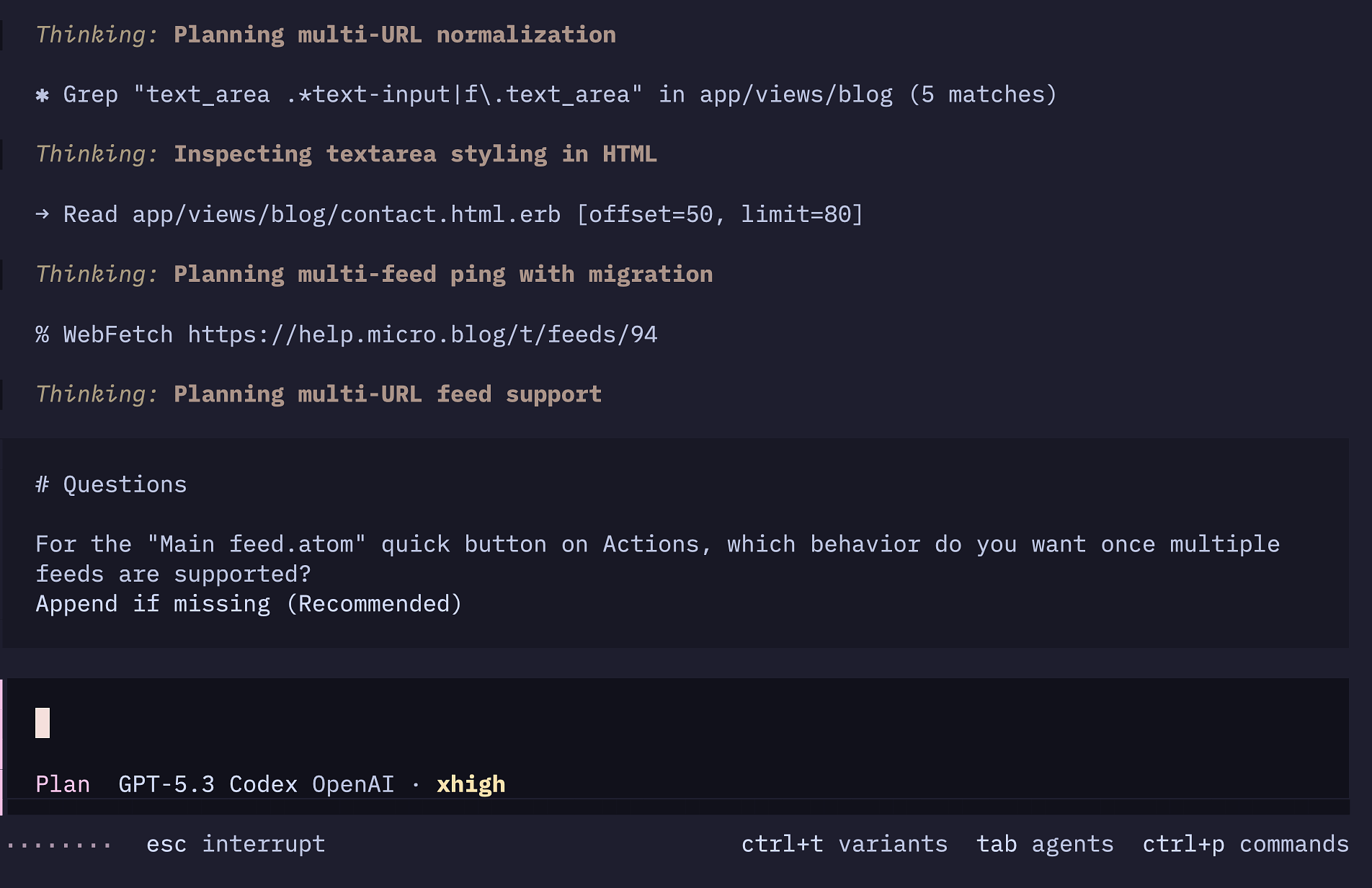 The thing I like about Codex is, is that it seems to do the right things as it's planning — just goes and explores, asks questions.
