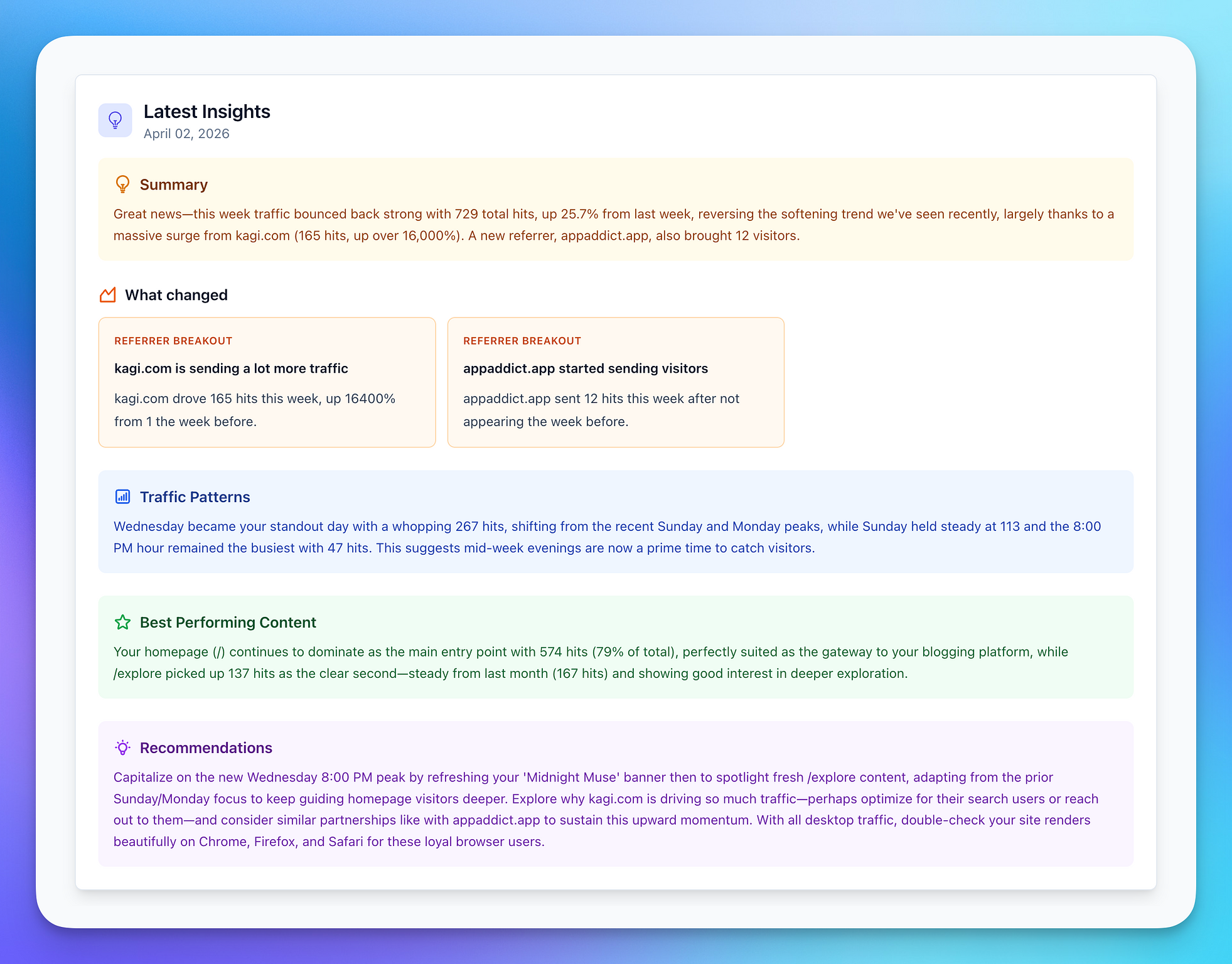 One thing I love about Tinylytics is the Insights feature. Runs every morning at 1AM (based on the site timezone) and takes a look at the day before and recent historical data and tells you what is what. Way easier to understand what's going on. Food for thought how I could make that more ingrained into the platform.