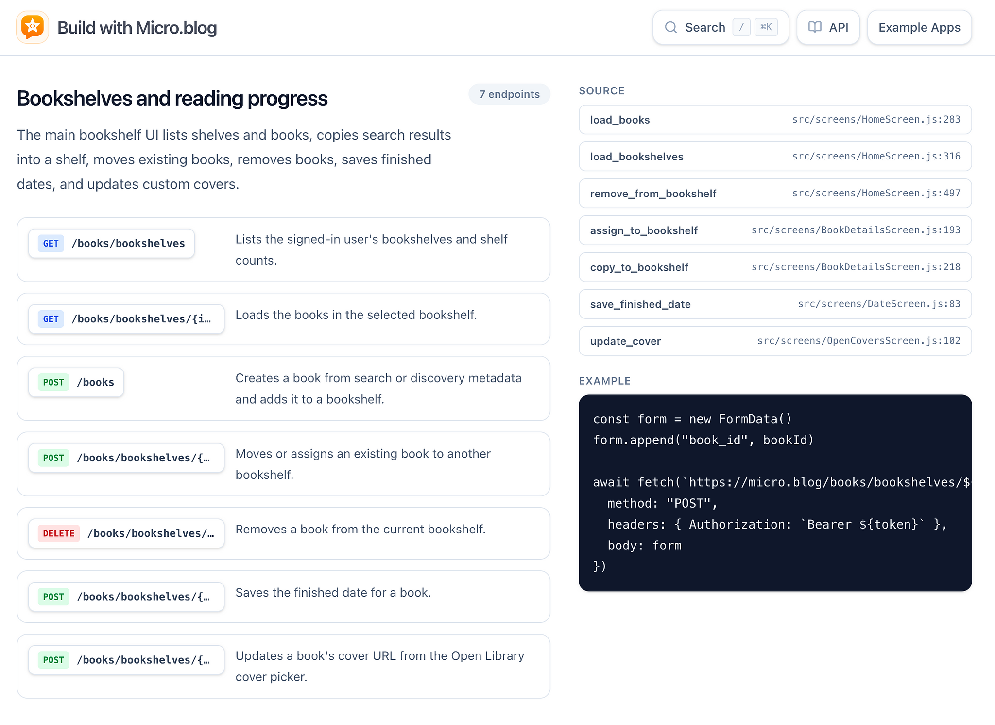 I'm adding example app integrations to "Build with Micro.blog" — goes through all of the open source apps, like Epilogue and all others, shows the endpoints and links to code files where relevant.